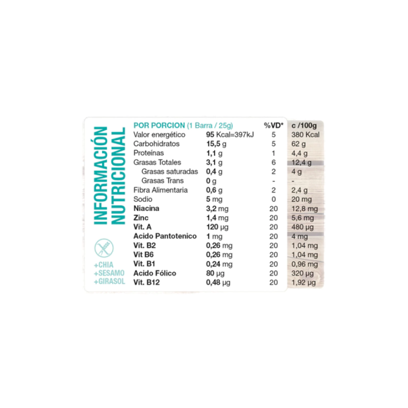 Ingredientes: Harina de Arroz, Sorbitol, Harina de Maiz, Maltodextrina, Aceite Vegetal, Semillas de Chía, Semillas de Girasol, Semillas de Sésamo, Cacao, Sal, EMU Lecitina de Soja, ARO Esencia de Chocolate, EDU Glicósidos de Steviol. Vitaminas B1, B2, B6, B12, Niacina, Ácido Pantoténico, Ácido Fólico, Vit. A, Zinc.