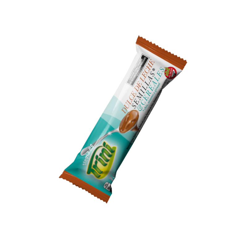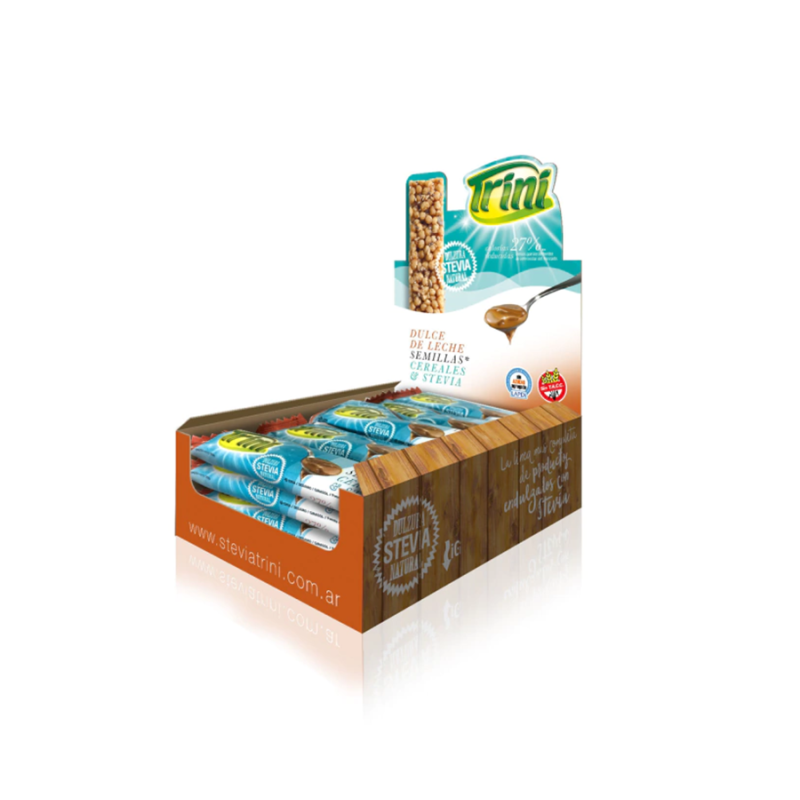 Barra de cereal dietética elaborada a base de copos de arroz, con agregado de dulce de leche Trini, semillas de chía, sésamo y girasol. Fuente de vitaminas y zinc. Endulzado con stevia.