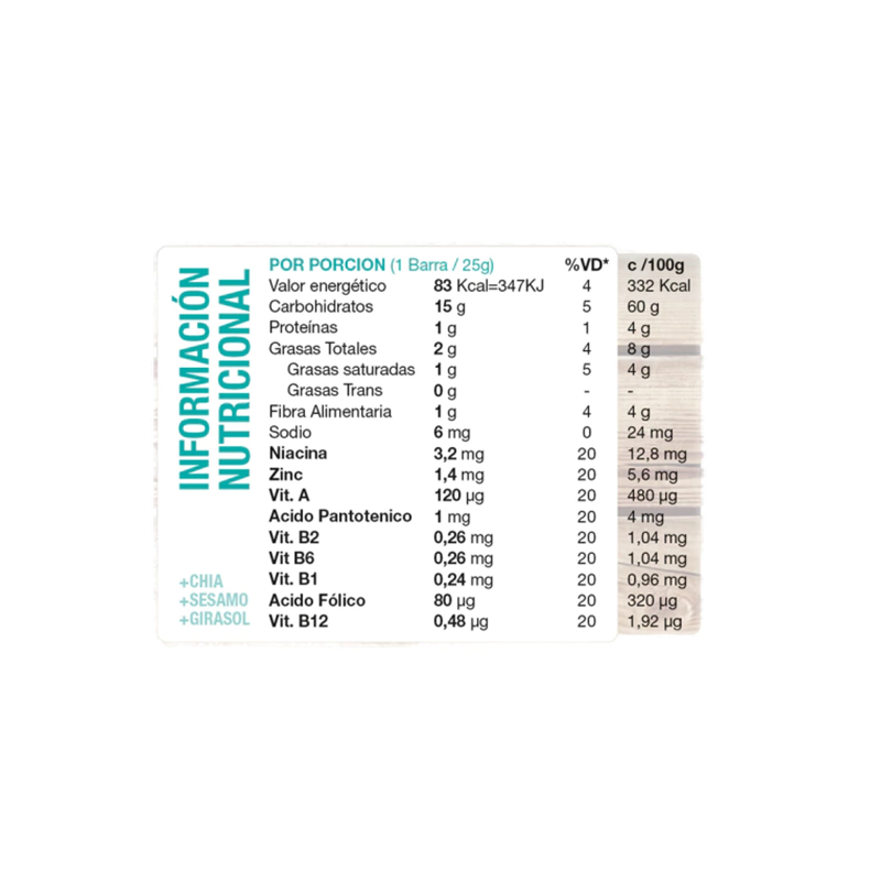 Vegetal, Semillas de Chía, Semillas de Sésamo, Semillas de Girasol, Sal, EMU Lecitina de Soja, ARO Esencia de Dulce de Leche, EDU Glicósidos de Steviol. Vits.B1, B2, B6, B12, Niacina, Ácido Pantoténico, Ácido Fólico, Vit. A, Zinc.