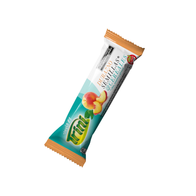 Barra de cereal dietética elaborada a base de copos de arroz, con agregado de mermelada de Durazno Trini, semillas de chía, sésamo y girasol. Fuente de vitaminas y zinc. Endulzado con stevia.