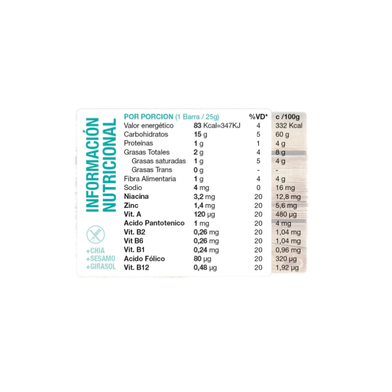 Ingredientes: Sorbitol, Arroz Expandido, EST Maltodextrina, Pulpa de Durazno, Aceite Vegetal Hidrogenado, Semillas de Chía, Semillas de Sésamo, Semillas de Girasol, ANTIOX Lecitina de Soja, ARO Esencia de Durazno, ACI Ácido Cítrico, EDU Glicósidos de Steviol, Vitaminas y Minerales: Niacina, Zinc, Vit. A, Ácido Pantoténico, Vit. B2, Vit. B6, Vit. B1, Ácido Fólico, Vit. B12.