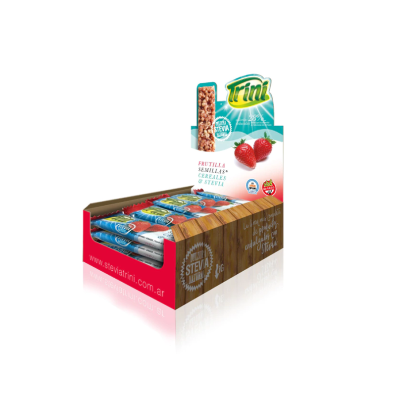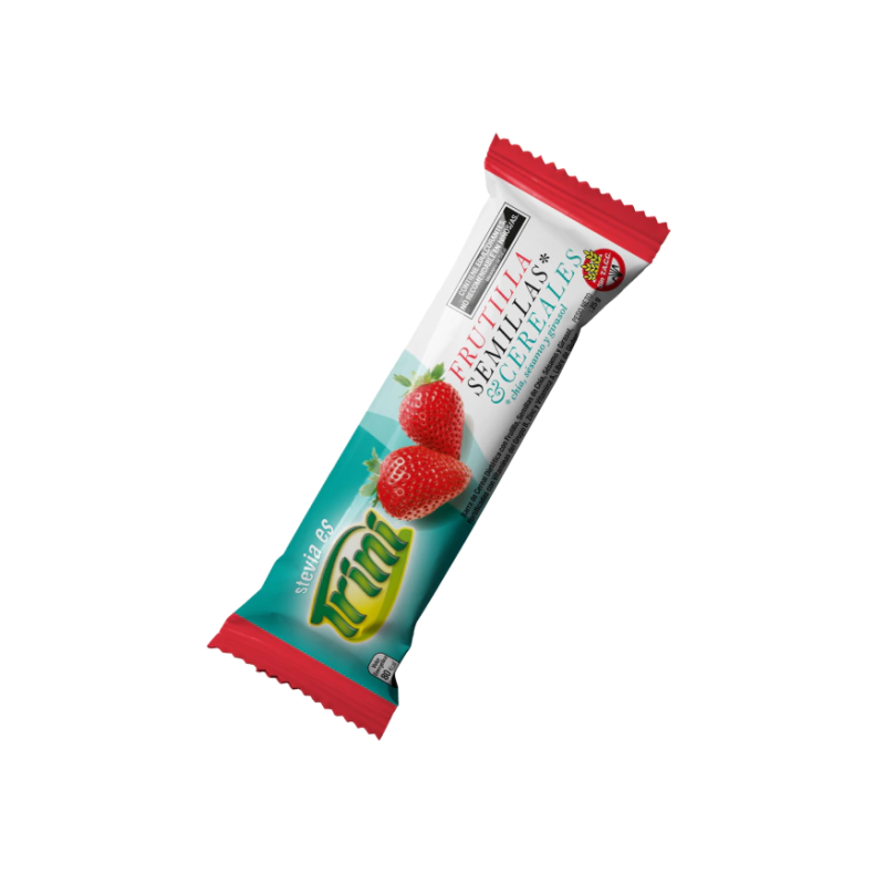 Barra de cereal dietética elaborada a base de copos de arroz, con agregado de mermelada de Frutilla Trini, semillas de chía, sésamo y girasol. Fuente de vitaminas y zinc. Endulzado con stevia.