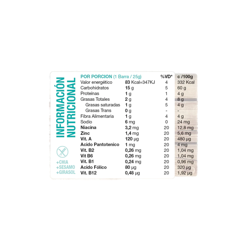 de Chía, Semillas de Sésamo, Semillas de Girasol, EMU: Lecitina de Soja, Sal, ACI: Ácido Cítrico, ARO: Esencia de Frutilla, EDU Glicósidos de Steviol. Vits. B1, B2, B6, B12, Niacina, Ácido Pantoténico, Ácido Fólico, Vit. A, Zinc., COL Rojo Allura.