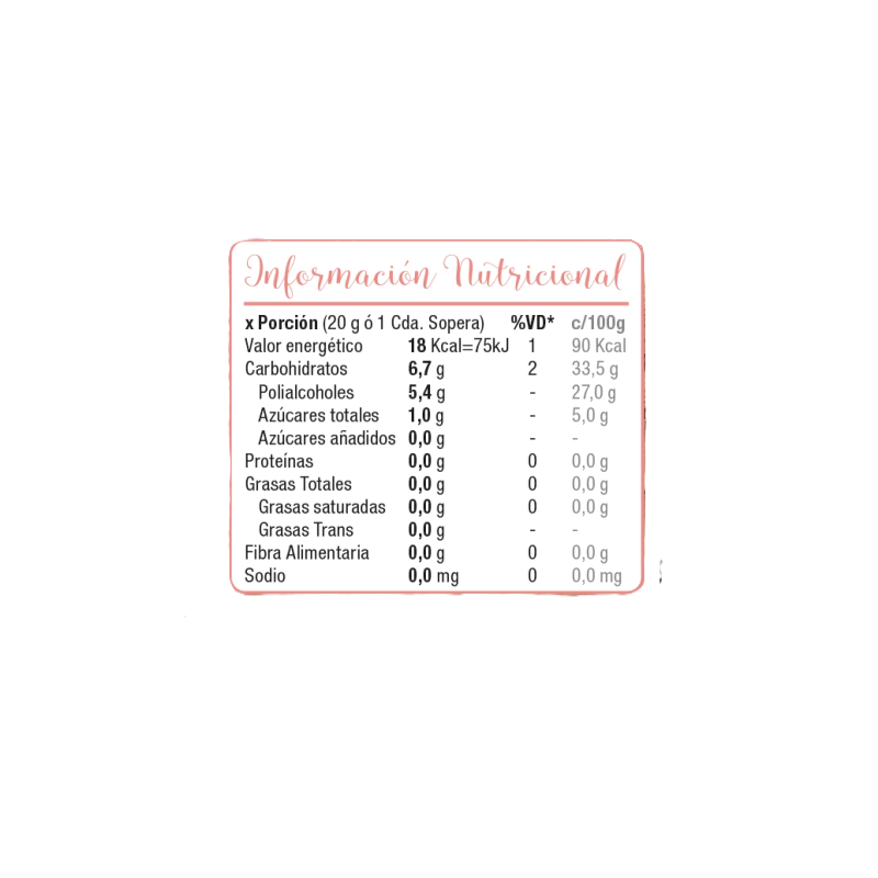 Ingredientes: Durazno, Jarabe de Sorbitol, EST: Carragenina, CONS: Sorbato de Potasio, ARO: Esencia Natural de Durazno, EDU: Glicósidos de Steviol, ACI: Ácido Cítrico