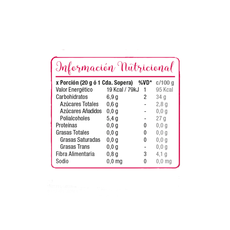 Ingredientes: Frambuesas, Jarabe de Sorbitol, GEL Pectina, Goma xántica,ACI: ácido cítrico, FIR: Lactato de calcio, CONS: Sorbato de Potasio,EDU: Glicósidos de Steviol, ARO: Esencia Natural de Frambuesa.