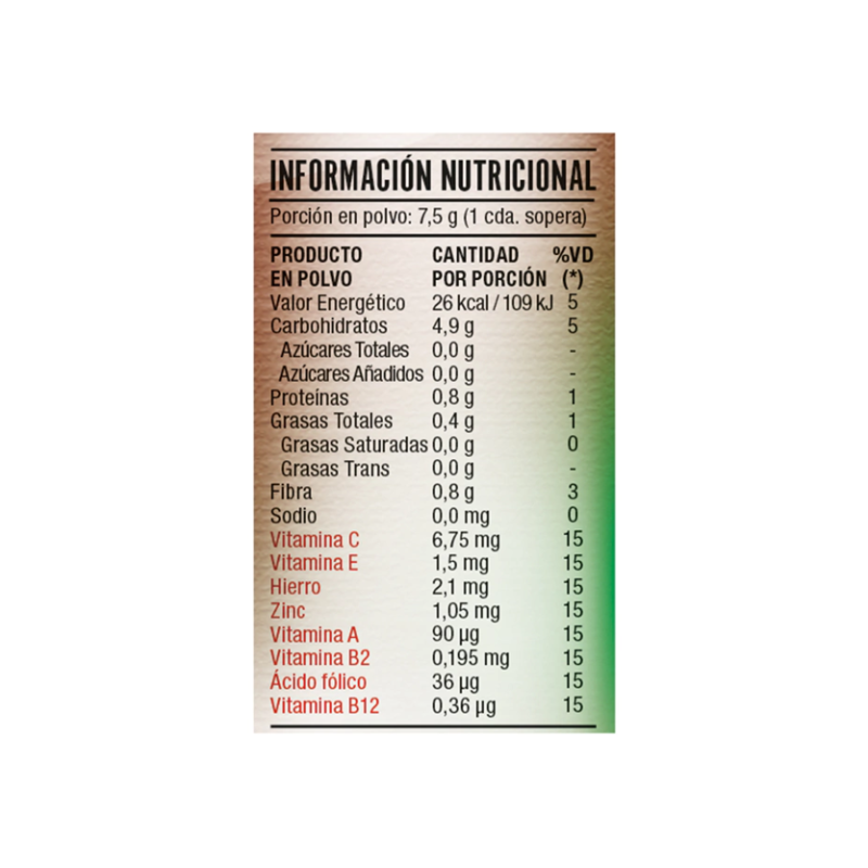 -Con vitaminas y minerales: Vitaminas A, C, E, B2, B12, Ácido Fólico Hierro y Zinc. (15% VD)