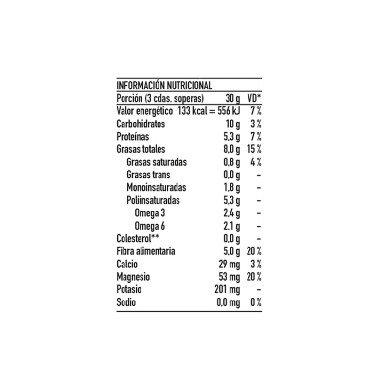 Es un alimento con alto contenido de Fibra, aportando el 20% del Valor Diario recomendado por porción; fuente de Magnesio (cubriendo el mismo %VD que la fibra) y Libre de Sodio. Tiene buen aporte de Proteínas, Omega 3 y 6.