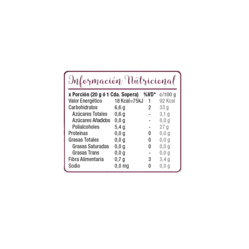Ingredientes: Moras, Jarabe de Sorbitol, GEL Pectina, Goma xántica,ACI: ácido cítrico, FIR: Lactato de calcio, CONS: Sorbato de Potasio,EDU: Glicósidos de Steviol, ARO: Esencia Natural de Moras.
