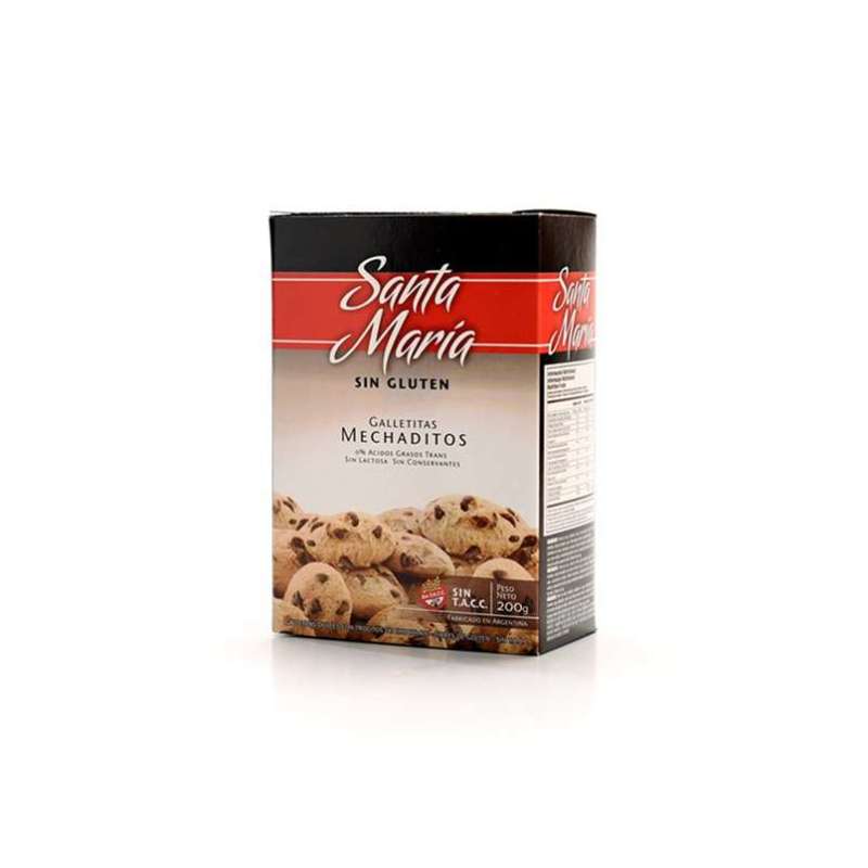 INGREDIENTES: Harina de arroz, almidón de maíz, aceite vegetal, azúcar, fécula de mandioca, chips de chocolate, huevo, fécula de papa, cacao, sal, agentes leudantes (bicarbonato de sodio, bicarbonato de armonio, fosfato monocalcico), estabilizantes (goma guar, goma xantica), emulsionantes (lecitina de soja), aromatizantes (esencia de chocolate, esencia de vainilla, esencia de limon). Contiene : huevo, soja.